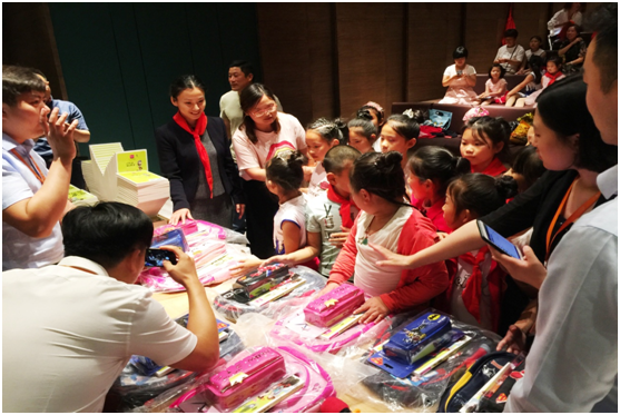 活動儀式上可愛的孩子們為到場嘉賓戴上了鮮艷的紅領巾,大家瞬間變身“大兒童”。媒體嘉賓各個化身愛心大使,紛紛與孩子們合影,為孩子們送上祝福。此外,除了捐贈圖書、愛心義賣,美盛地產集團和新華書店也為孩子們精心準備了兒童節禮物,書包、繪本、文具、玩具……孩子們幸福快樂的笑臉成為了此次公益行動最完美的收獲。