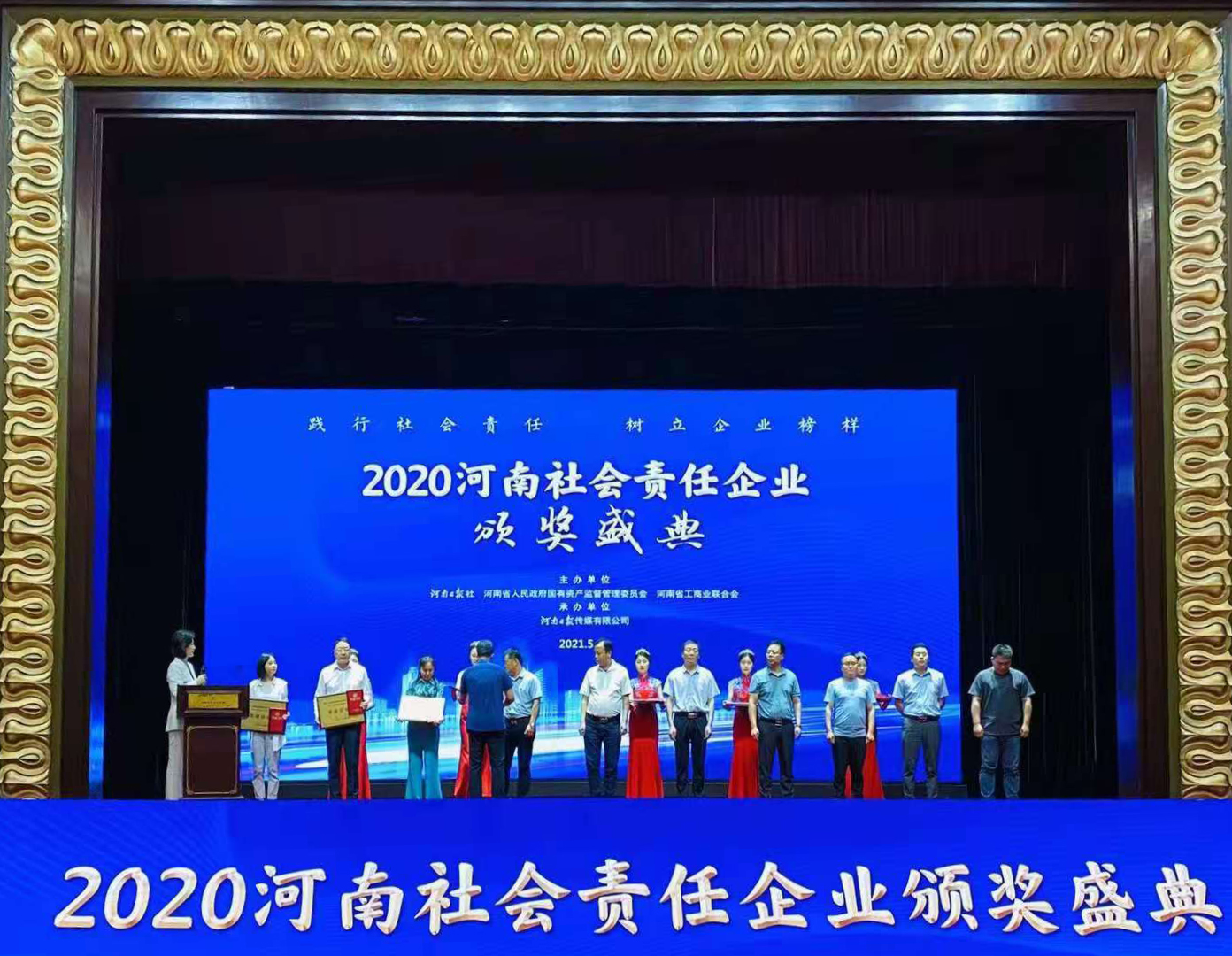 首頁 > 新聞中心 > 公司新聞2021年5月21日,由河南日報社、河南省國資委、河南省工商業(yè)聯(lián)合會聯(lián)合主辦,河南日報傳媒有限公司承辦的“2020河南社會責(zé)任企業(yè)”推選活動頒獎典禮在鄭州黃河迎賓館隆重舉行。