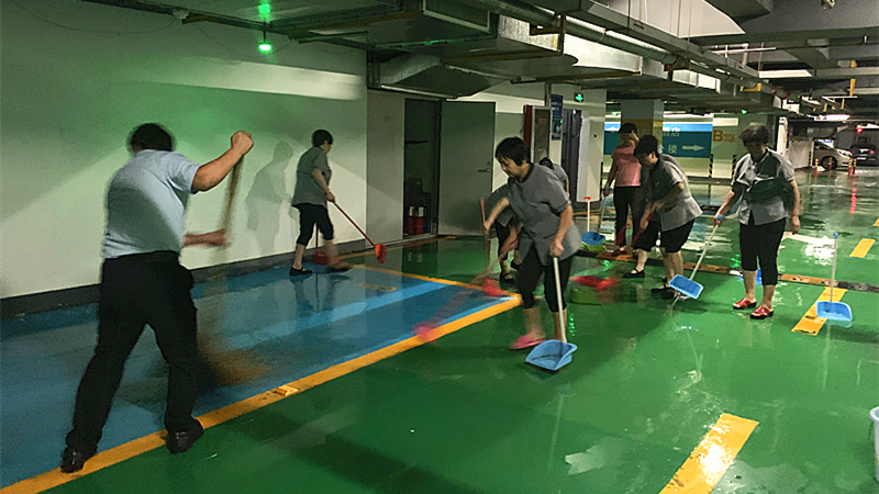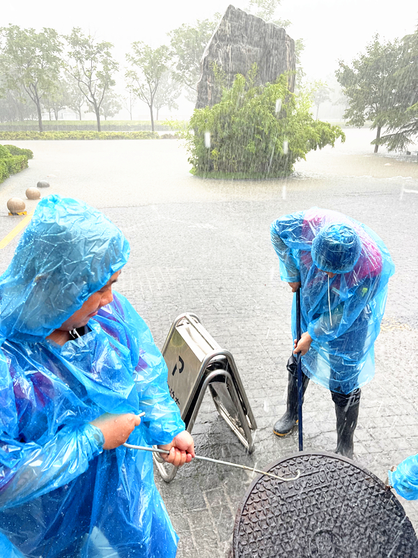 在雨水絲毫不減,越下越急的危機(jī)時刻,工程部師傅們毅然踏入水中,一點(diǎn)一點(diǎn)清理被堵的排水口,盡全力保障業(yè)主家園安全。平均年齡比其他各部門都高的環(huán)境部工作人員,絲毫沒拖任何后腿,全力向前,爭分奪秒地不間斷補(bǔ)位吸水排污,順利完成美盛中心地下三層車庫無積水出現(xiàn)任務(wù)。