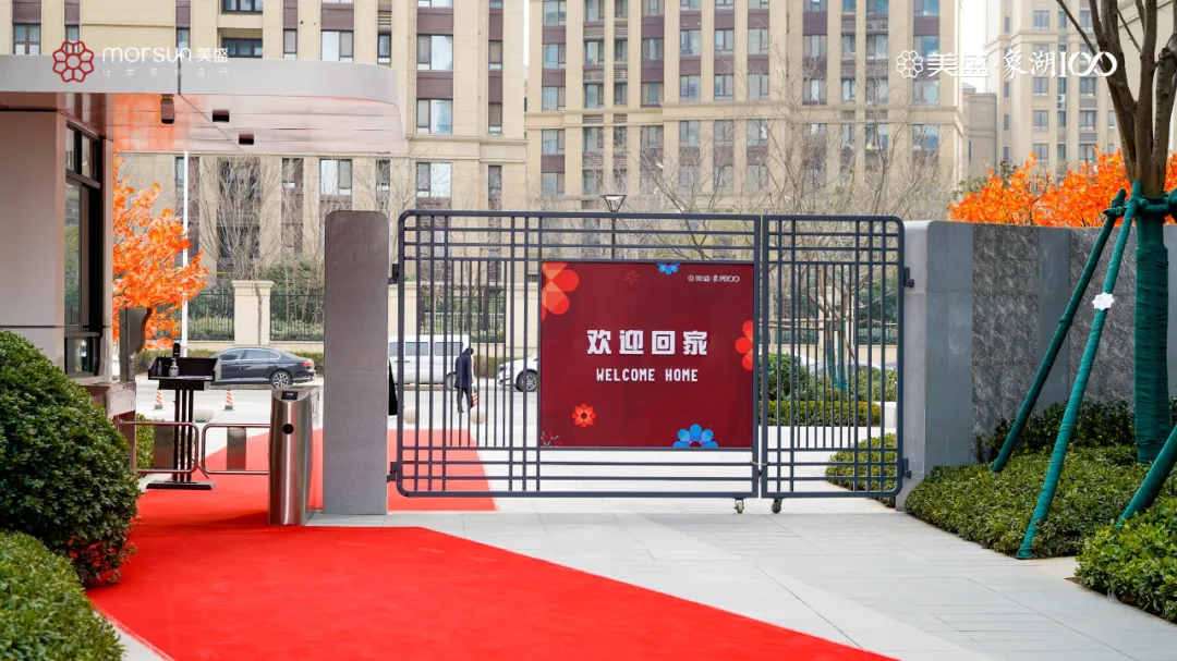 “您好,歡迎回家!”的貼心問候,執禮相迎的工作人員,大門口紅紅火火的楓樹裝飾,門前、小區內鋪設的紅毯,象征著喜悅的花柱及掛滿枝頭的燈籠,余音繞梁的溫馨歸家曲……以尊崇禮序為業主們的歸家路引航。