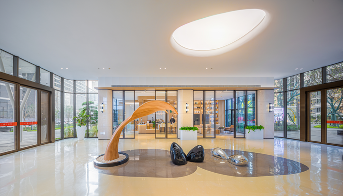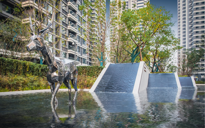 穿過(guò)歸家大堂,映入眼中的是大面積疊水瀑布景觀,飛花濺玉,水聲淙淙,錦鯉歡游;水系周圍,造型烏桕樹(shù)陣姿態(tài)遒勁,建筑與綠樹(shù)的倒影隨水波而流動(dòng),盡顯活力與生機(jī)。