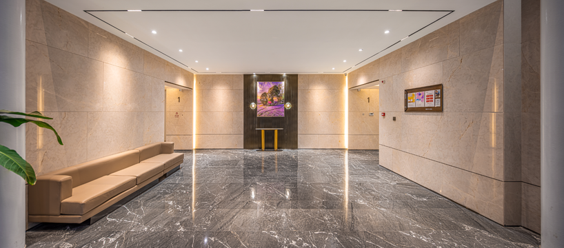 首層單元入戶大堂,同樣以高規(guī)格現(xiàn)代風(fēng)格進(jìn)行精裝,落地玻璃單元大門搭配金屬細(xì)節(jié),呈現(xiàn)明亮、清雅的空間感,大堂空間全鋪設(shè)石材、以藝術(shù)畫裝點(diǎn),綠植、休息沙發(fā)等也已就位,帶給居者舒適的視覺(jué)享受和品質(zhì)體驗(yàn)。