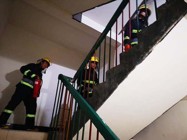 消防大隊負責人,現場講解消防器材、消防水帶的使用要領,以及講解了撲滅初起火災的注意事項等。學習之后,部分人員參加滅火器使用的實戰演練,將熊熊燃燒的大火撲滅。