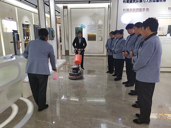 保潔員們依序清洗滿地業主的地墊,管家們在一旁與業戶分享清洗地墊、雜物的小妙招。